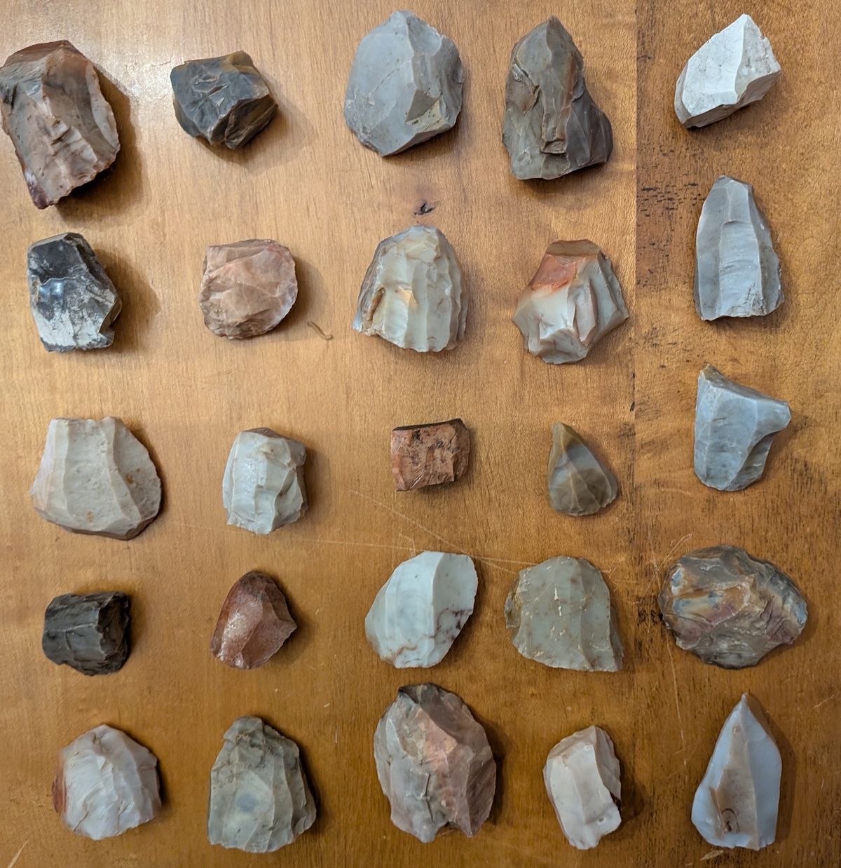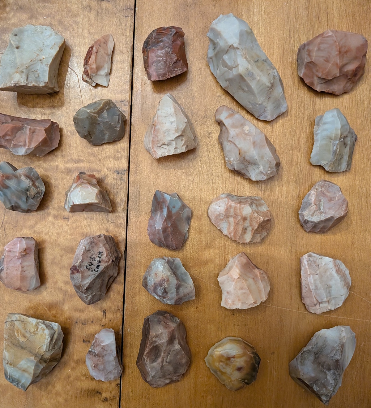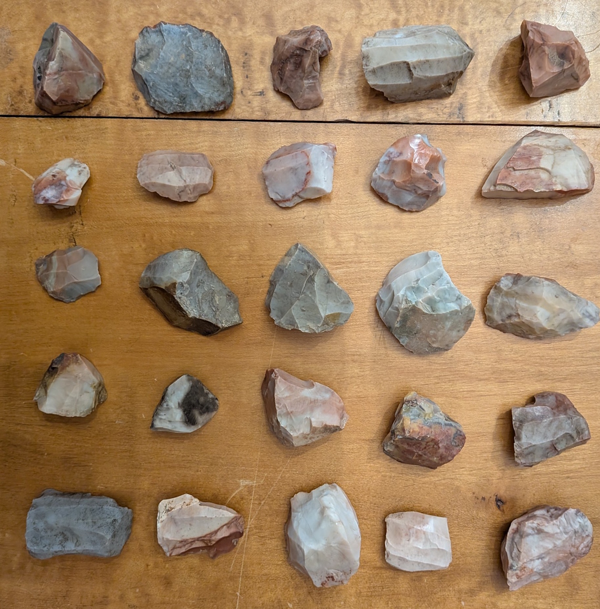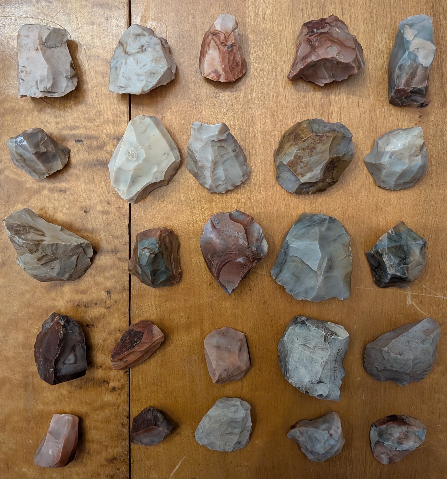 Your choice of 4 different collections of 25 Hopewell, Flint Ridge cores, #1 thru #4, and include nice examples of conical, tabular and irregular forms, all with multiple facets. Ex Gilbert Dilley collection, who owned and later donated the land where Flint Ridge State Park was built. He is pictured in Who's Who #1.