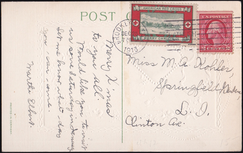 1913-2A 12-25 Brooklyn, NY (type 2A - with green circles around Red Crosses in side panels, and “green” “closed” or “filled” ribbon), Current catalog value $1000, Very Rare $675.00