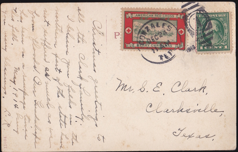 1913-2B tied on December San Antonio, real photo flood postcard with printed date 12-4-13. 1913 is unreadable in postmark, but text of postcard mentions the recent flood (October 1 thru early December, 1913) (type 2B - with green circles around Red Crosses in side panels, and “red” “open” ribbon), Current catalog value $1500, Very Rare $950.00